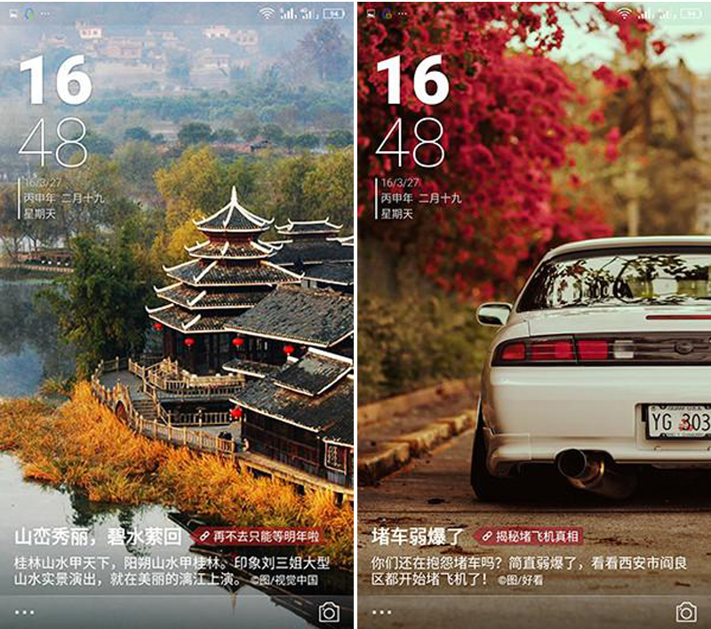 金立S8搭载了Amigo 3.2,对于之前用过这个系统的人来说一定不会陌生。金立S8可以说是对系统进行了升级和创新,比如“故事锁屏”,它依然每天会推送多张高清壁纸,左右单手滑动即可自由切换,可以为用户带来新鲜感。不过在页面布局上,时间和日期移动到了页面左上角。
