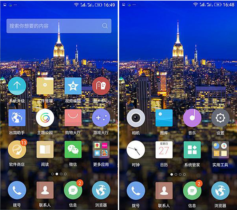 桌面图标则以圆角矩形和圆形为主,支持桌面文件夹管理以及快速卸载等常见功能。
