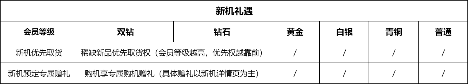 新机预售时,钻级以上会员可通过专属通道,享积分兑换或直接优先预订稀缺商品优先预购/预订,具体请以会员俱乐部权益实时显示为准。
