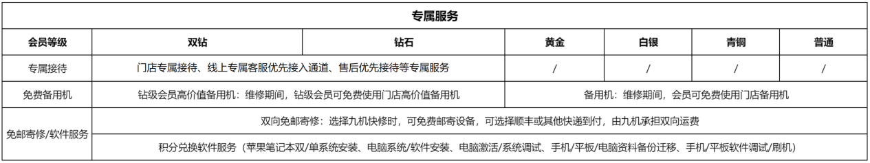会员享免费备用机、免邮寄修和软件服务等会员专属服务,钻石/双钻会员享高价值备用机、线上专属VIP客服接入通道、线下门店专属接待服务、售后优先接待等权益,九机将不定期进行专属服务内容调整、升级,具体请以会员俱乐部权益实时显示为准。