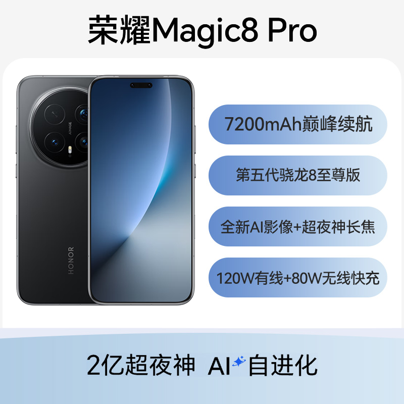 荣耀Magic8 Pro 全网通5G版 绒黑色 16GB+1TB 2亿超夜神,AI自进化;7200mAh巅峰续航;第五代骁龙8至尊版;全新AI影像+超夜神长焦;