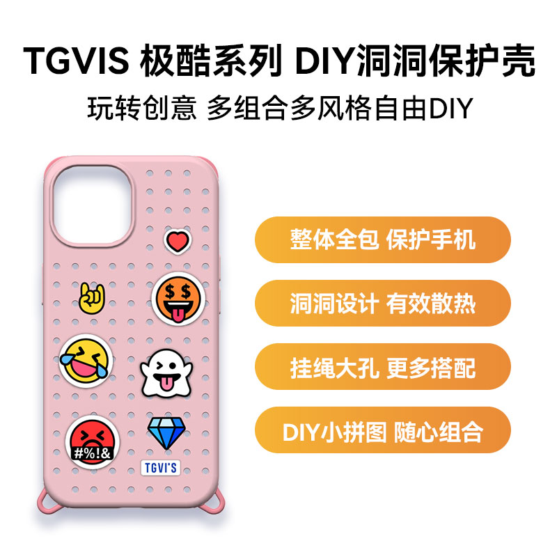 TGVIS iPhone 15系列 极酷系列 DIY洞洞保护壳 粉红 iPhone 15 玩转创意,多风格Pin结合洞洞设计,自由DIY风格,TPU防撞,手感舒适耐磨