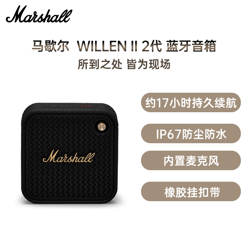 马歇尔 WILLEN II 2代无线蓝牙便携音箱 黑金色 Willen II支持通话功能,搭载内置麦克风,实现免提电话沟通。将音箱随处一放,免提接听解放双手。