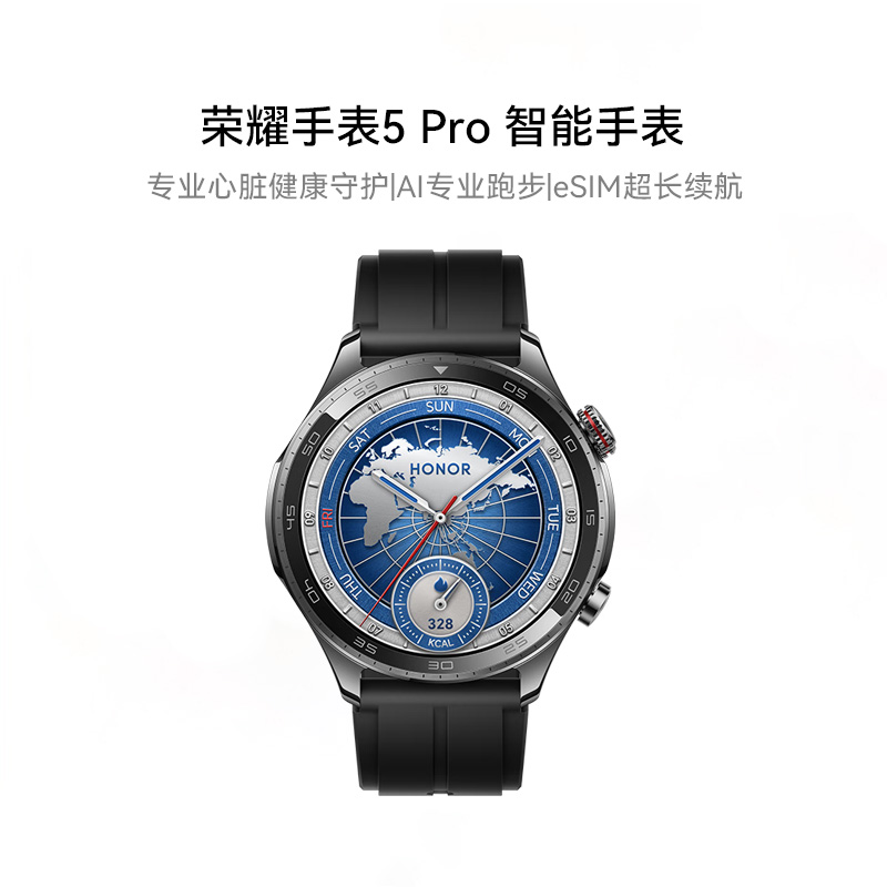 荣耀手表5 曜石黑硅胶表带 搭载荣耀北极星定位系统,跑步轨迹更精准。腕上一键体检,eSIM十天长续航,AI减脂助手
