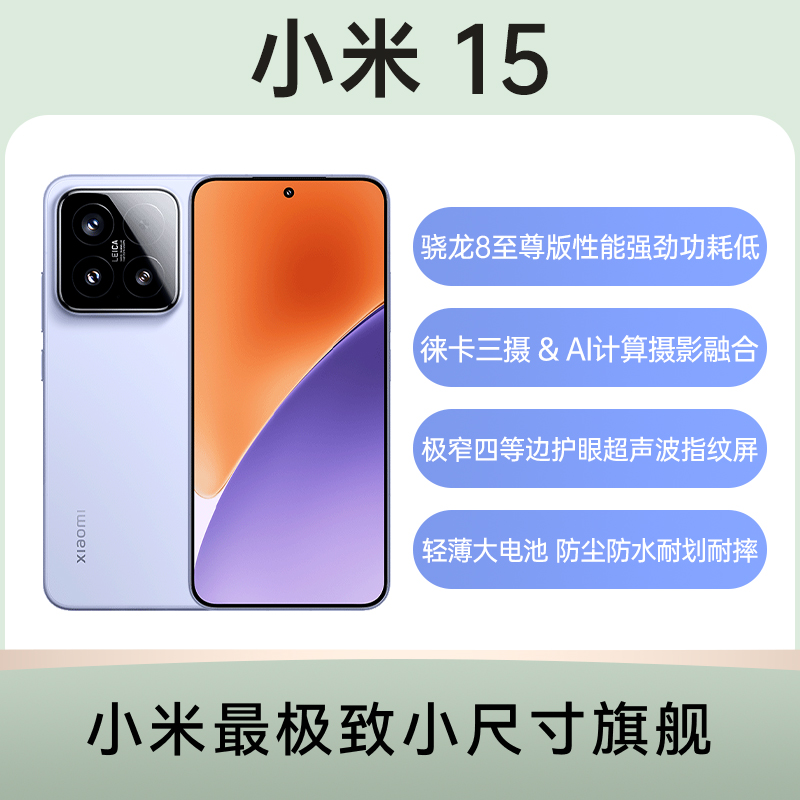 小米 15 全网通5G版 丁香紫 12GB+256GB 标准版 骁龙8至尊版性能强劲功耗低;徕卡三摄 & AI计算摄影融合;极窄四等边护眼超声波指纹屏;轻薄大电池 防尘防水耐划耐摔