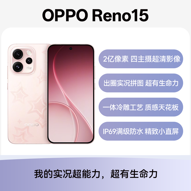 OPPO Reno15 全网通5G版 星星粉 16GB+256GB 四主摄超清影像系统,拍人拍景拍物,怎么拍都清晰;出圈实况拼图,一拍二拼三出圈,超有生命力;实况照片极速互传,iPhone和OPPO都能超快互传;超流畅 ColorOS 16;IP69 &IP68 &IP66 三重认证,防热水、浸水和喷水;精致小直屏,精巧好手感