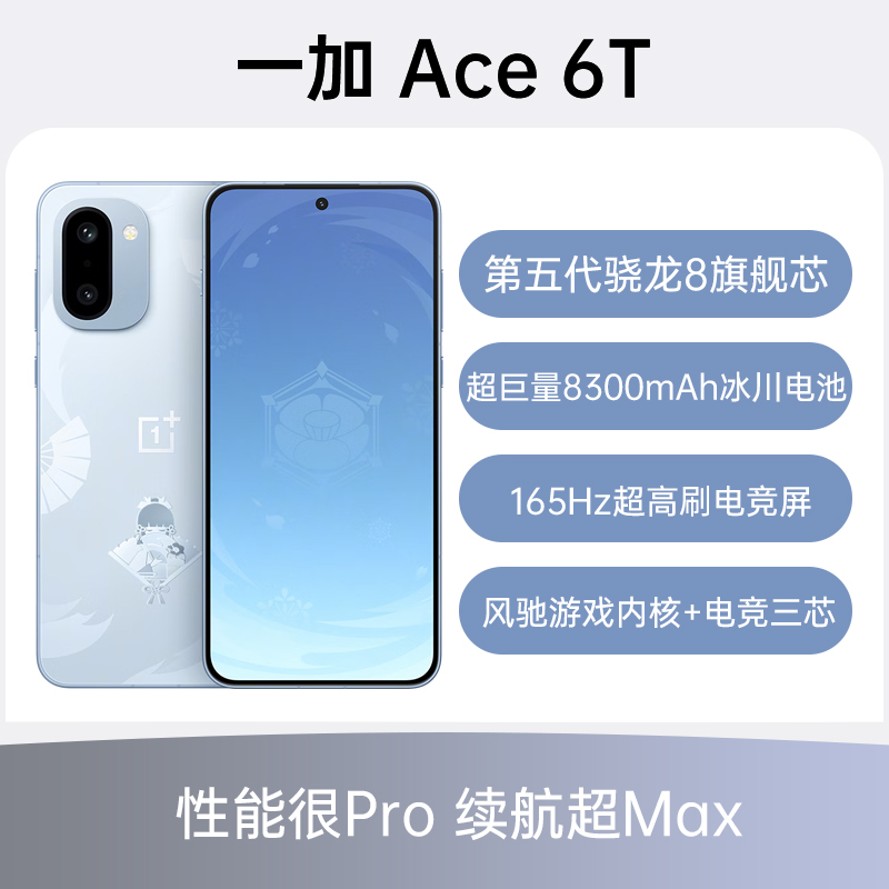 一加 Ace 6T 全网通5G版 神里绫华定制版 16GB+512GB 第五代骁龙8旗舰芯片;风驰游戏内核;超巨量8300mAh冰川电池;165Hz超高刷电竞屏;IP66 & IP68 & IP69 & IP69K防尘防水大满贯;3D超声波指纹