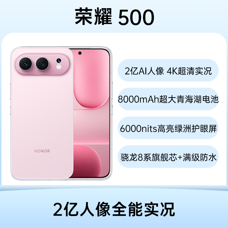 荣耀500 Pro 全网通5G版 月光银 16GB+1TB 【肖战同款】骁龙8至尊旗舰芯+IP68&IP69&IP69K满级防水;8000mAh青海湖电池;2亿人像全能实况;6000nits高亮绿洲护眼屏;荣耀自研射频增强芯片C1+,演唱会抢票快人一步;一体化冷雕玻璃,外观美得浑然一体