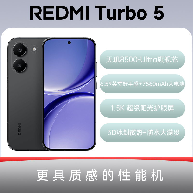 红米 REDMI Turbo 5 全网通5G版-不可享国补 暗影黑 12GB+256GB 该商品未拆封未激活,可正常享受新机质保服务;不与国家补贴和其他优惠叠加,每款数量有限,抢完即止!