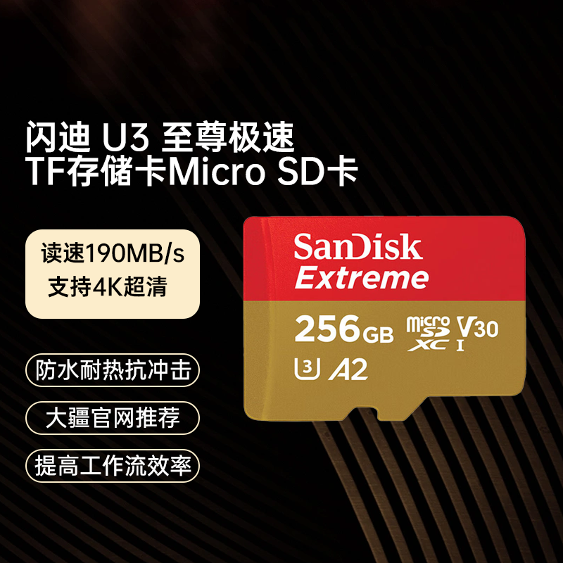 闪迪 U3 至尊极速TF存储卡Micro SD卡 256G 支持4k视频,防水耐热抗冲击,匹配运动相机和无人机,快速运行app