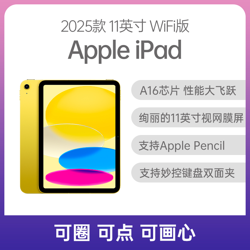 Apple iPad 2025款/第11代 11英寸 WiFi版 黄色 256GB 标准版 A16芯片性能大飞跃;绚丽的11英寸视网膜屏;支持Apple Pencil+妙控键盘双面夹,更加神通广大