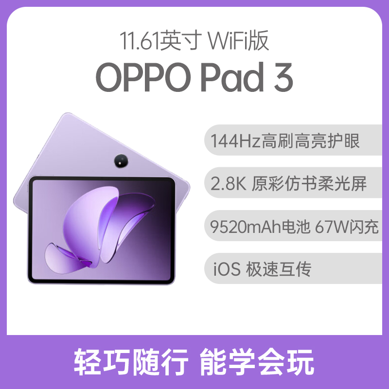 OPPO Pad 3 11.61英寸 WiFi版 霞光紫 柔光版 8GB+256GB 144Hz高刷高亮还护眼;536g轻薄衬手;AI长文快速摘要;外语轻松翻译;AI 一键问屏;iOS 极速互传;旗舰性能输出稳定,流畅冷静;
