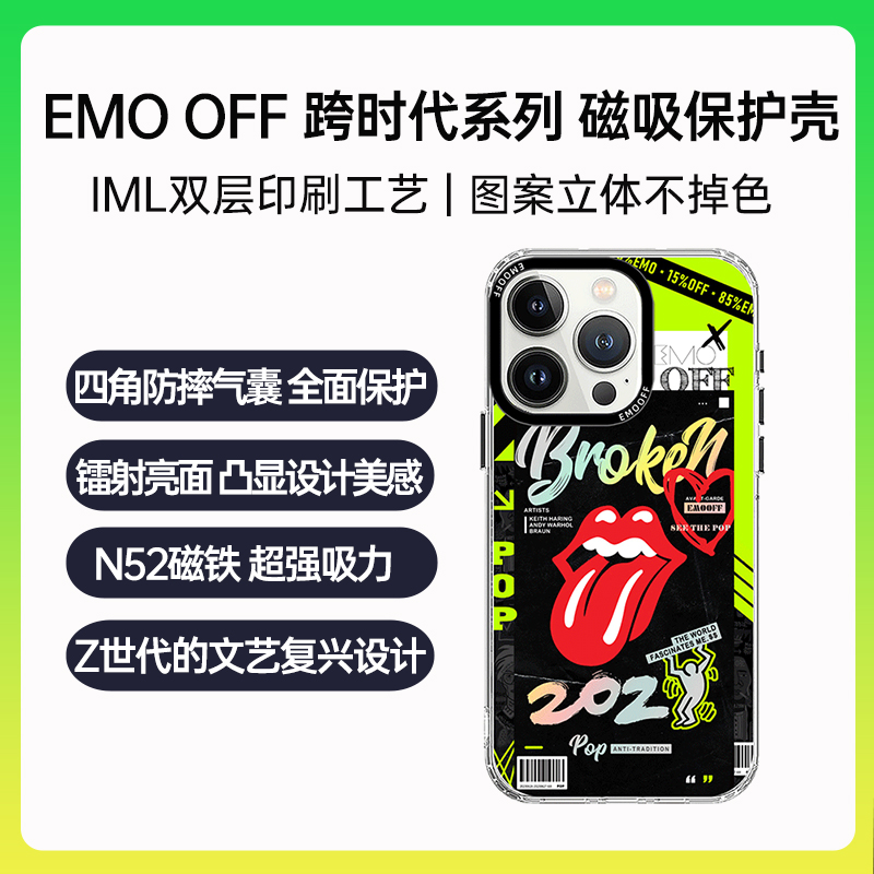 EMO OFF iPhone 15系列 跨时代系列 Magsafe磁吸保护壳 波普 iPhone 15 Pro 四角防摔气囊 全面保护,防污防指纹,IML双层印刷工艺,图案立体不掉色