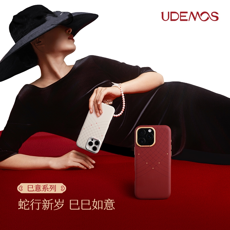 Udemos iPhone16 Pro Max 皮革 巳意系列 磁吸手机壳 安可拉红 「巳意新生」Udemos以二重线重构蛇鳞纹,五颗浮雕点印绘出蛇首,用现代的几何线条,诠释东方形意美学