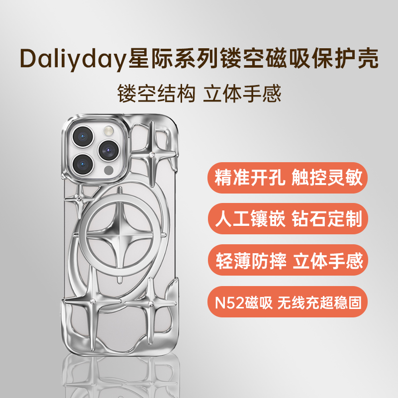 Daliyday iPhone 16 Pro 星际系列镂空磁吸保护壳 星际银 全新PC材质,采用镭镀电雕工艺,经过多次的调色矫正,透光率显著提升,手机壳久用不发黄