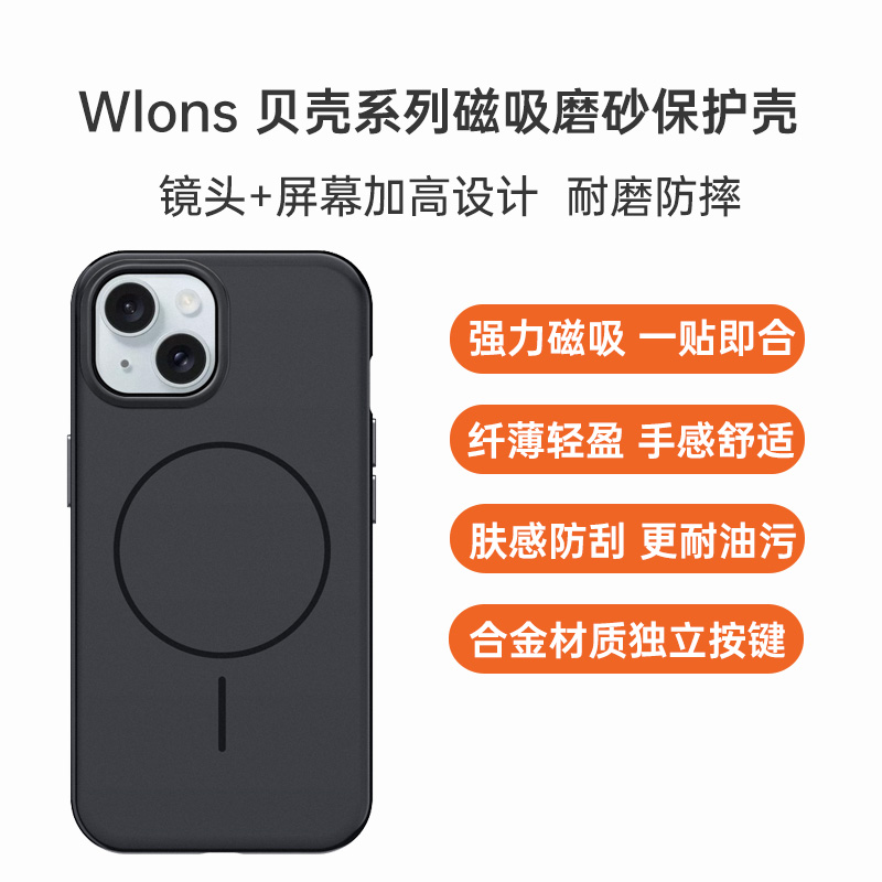 Wlons iPhone 15系列 肤感岩沙磁吸保护壳 黑色 iPhone 15 边框双层纹路,防滑防汗,亲肤材质,手感细腻