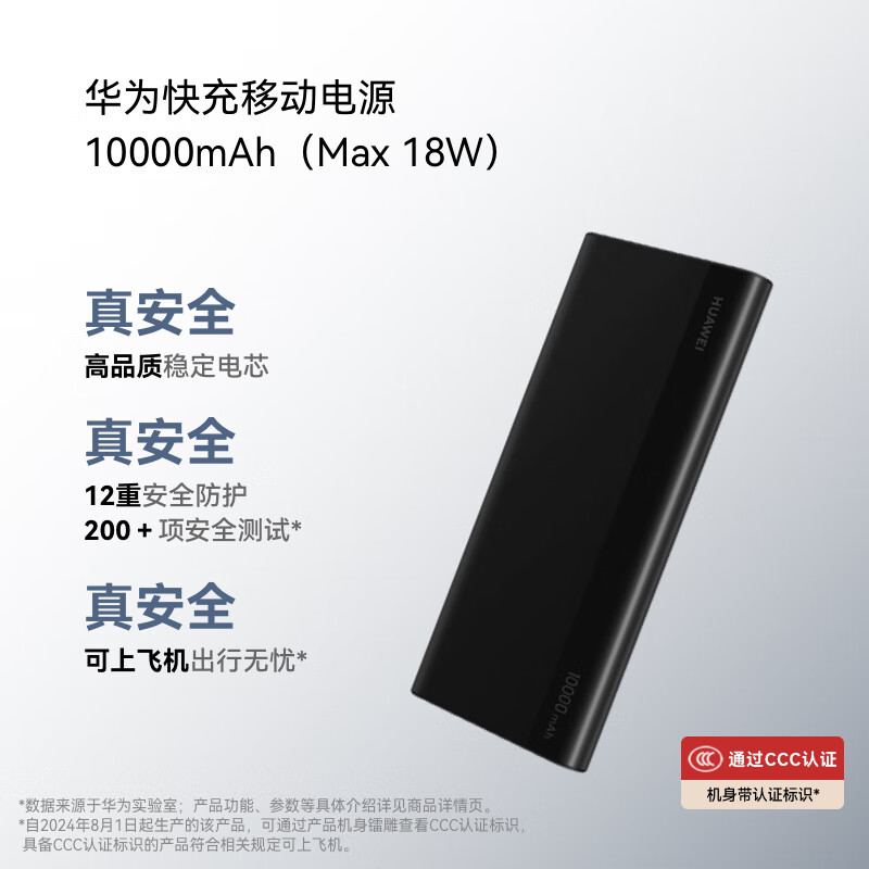 华为 10000mAh 18W Type-C版快充移动电源 黑色 CCC认证,12重安全防护,可上飞机