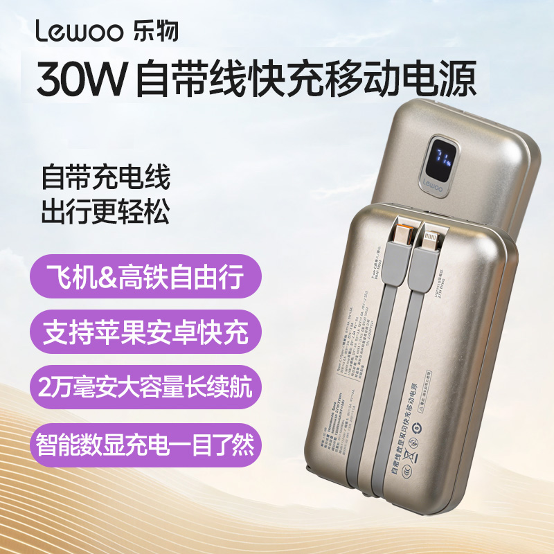 乐物 20000mAh 30W 自带双线数显双向快充移动电源 钛原色 符合国标3C认证,自带C线可为移动电源充电,全新升级钛原色,自带苹果线支持iPhone最高27W快充