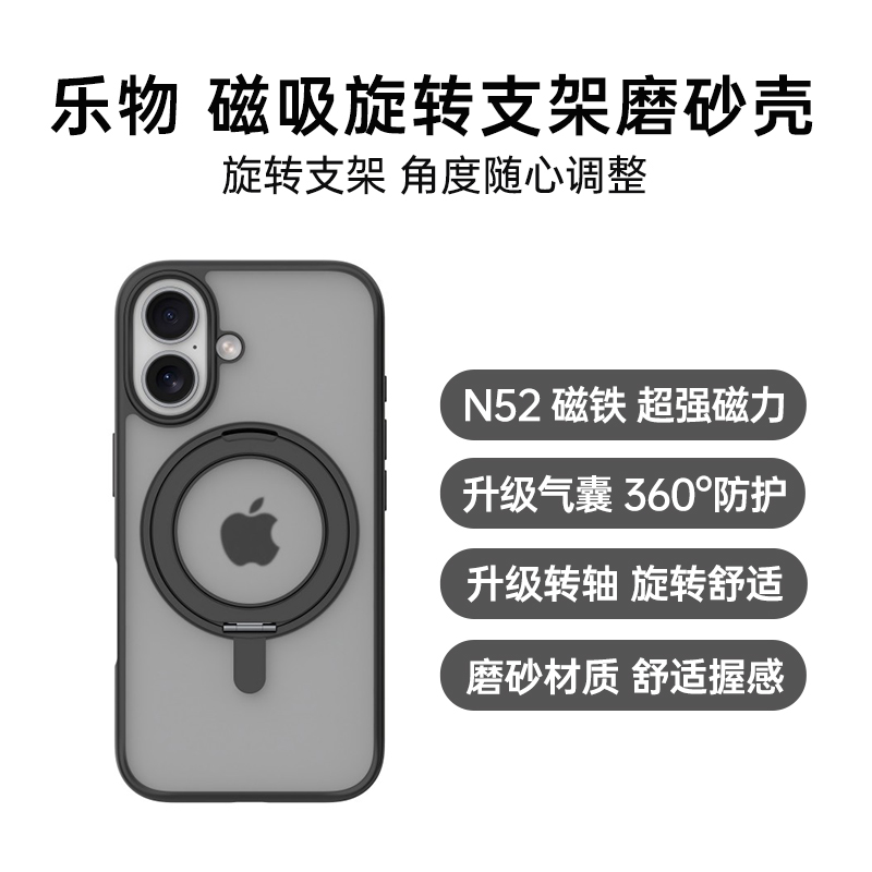 乐物 iPhone 16 Plus MagSafe 磨砂磁吸 旋转支架保护壳 黑色 金属支架,超强支撑力 ,升级气囊,360°防护