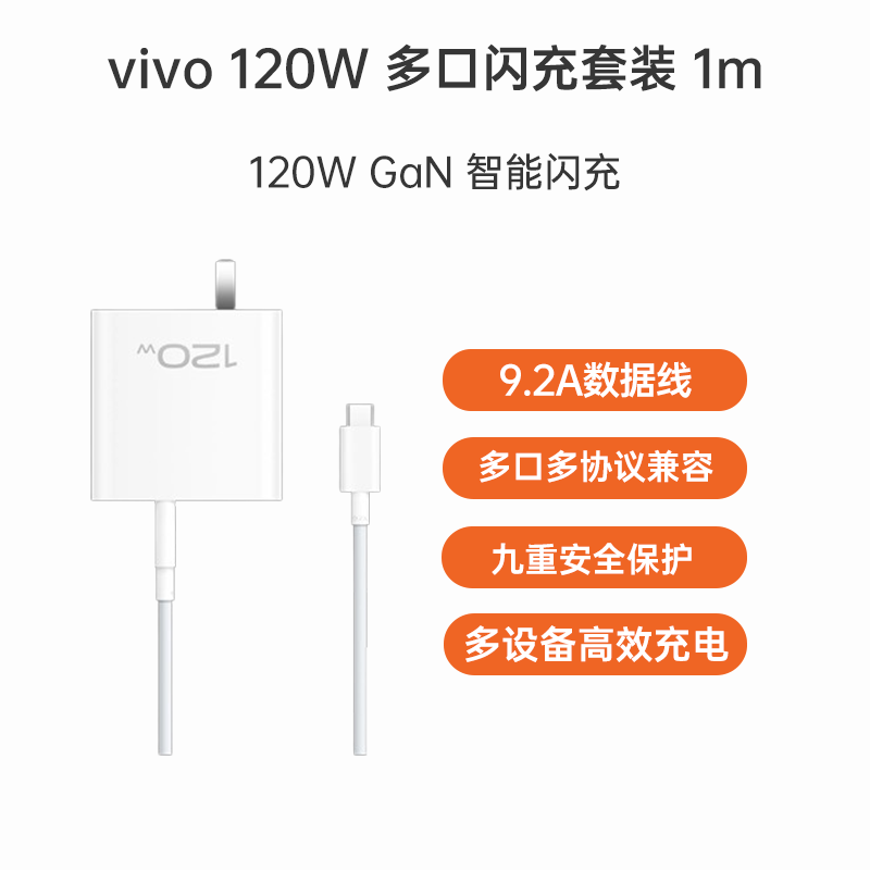 vivo 原装120W 三口闪充充电器套装 三口充电器+9.2A Type-C转Type-C数据线