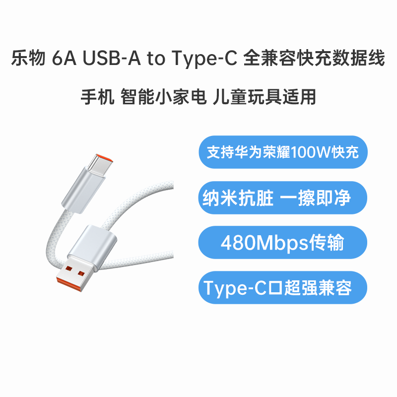 乐物 6A USB-A to Type-C 全兼容快充数据线 适配华为/荣耀/苹果 1.2m 6A大电流全兼容快充,100W大功率输出,低温快充不伤机。HarmonyOS 5及HarmonyOS Next以上版本由于系统兼容性,目前仅支持最高60-66W快充。
