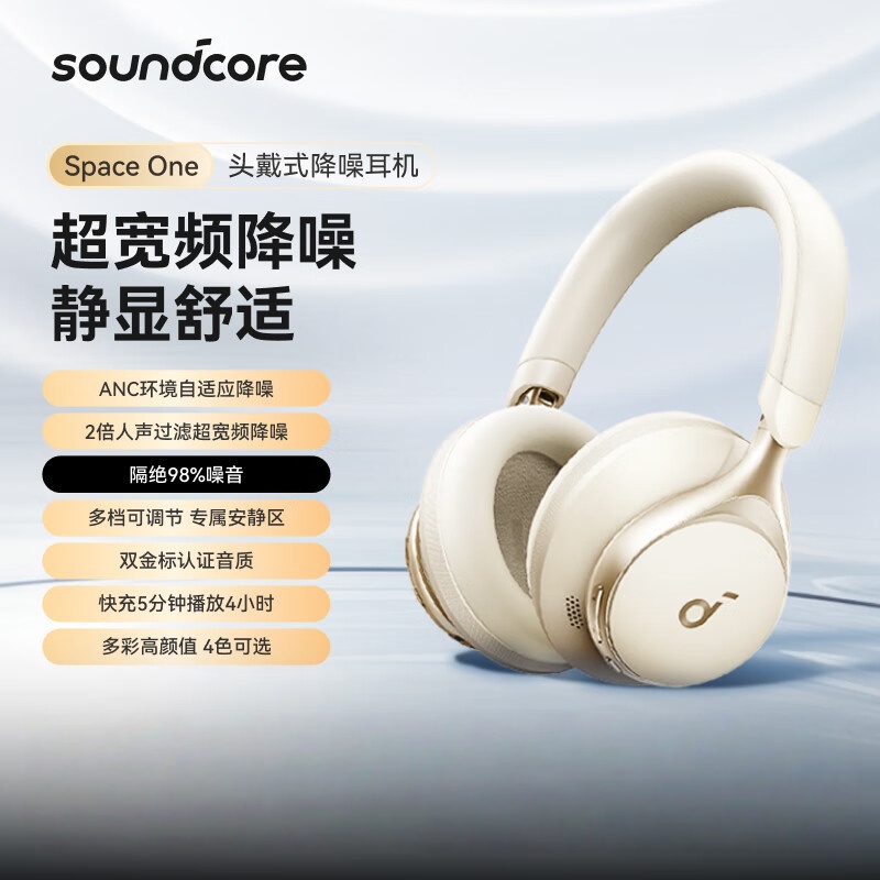 声阔 Space One 头戴蓝牙耳机 白色 2倍人声过滤,超宽频降噪;支持快充55小时长续航,精准匹配环境,自适应降噪