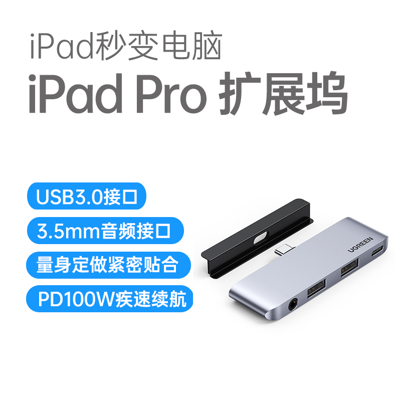 绿联 5合1 iPad Pro直插拓展坞 USB3.0x2+PD+HDMI+音频 四合一简约款 多接口扩展,iPad秒变电脑