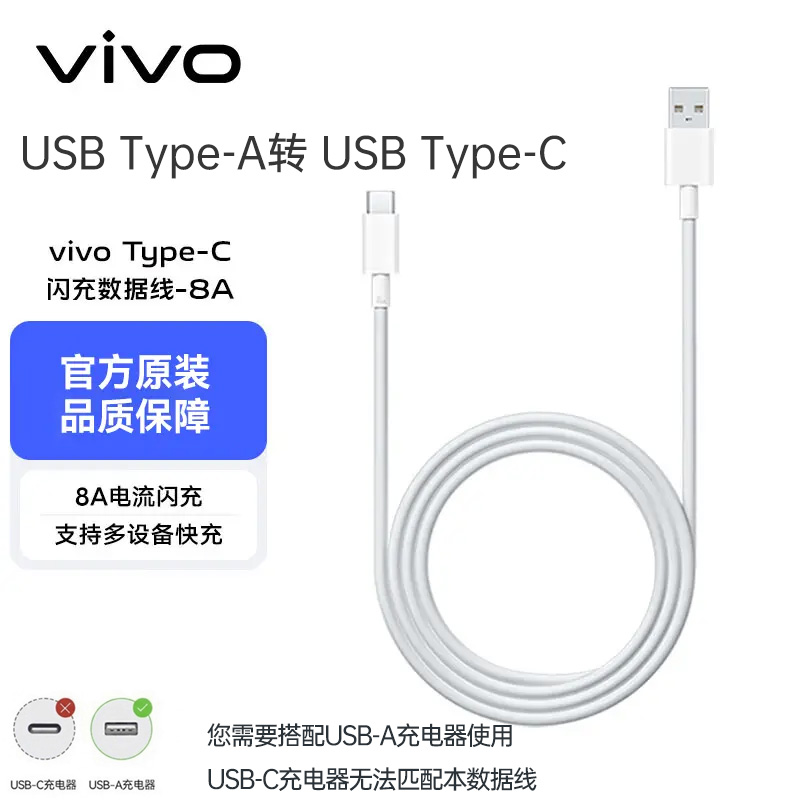 vivo 原装 8A USB-A to Type-C闪充数据线 适配IQOO 灰色 1m 8A大电流 ,适配多档位快充,广泛兼容手机平板