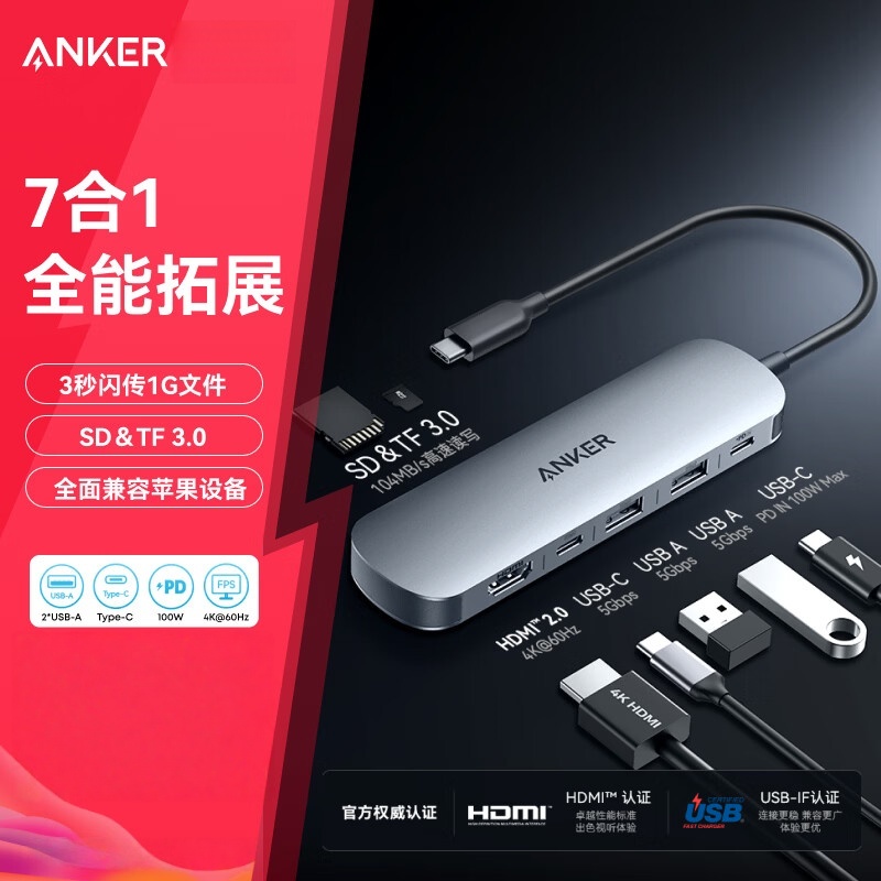 绿联 7合1 USB-C 千兆网口拓展坞 USB3.0x2+HDMI+千兆网口+PD+读卡 4K60Hz超高清,还原帧帧细节;5Gbps疾传,1G文件约3秒传;千兆网口,有线网络更稳定