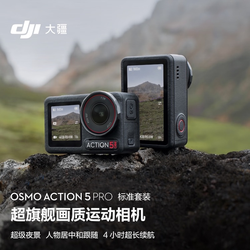 大疆 DJI Osmo Action 5 Pro 灵眸运动相机 标准套装 日夜出彩,超旗舰画质运动相机。新一代 1/1.3 英寸传感器,人物居中和跟随,360° 地平线增稳,双 OELD 高亮触摸屏,4 小时超长续航