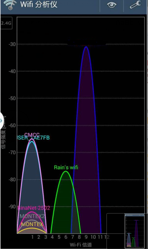 测试周边wifi的数量、强度等状况,不一定要专业的设备,安卓手机上都可以找到、安装一些wifi分析的APP,装上后就可以直接测量。主要是看所有的wifi信号使用的信道的情况,看看你的路由器信道是不是落在最多的wifi源上,是的话就要避开它们。